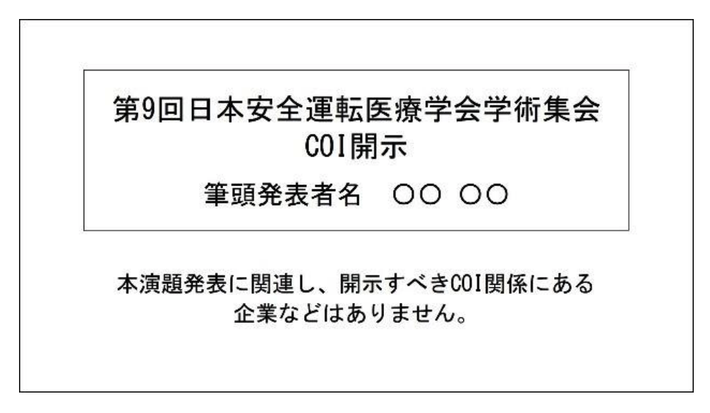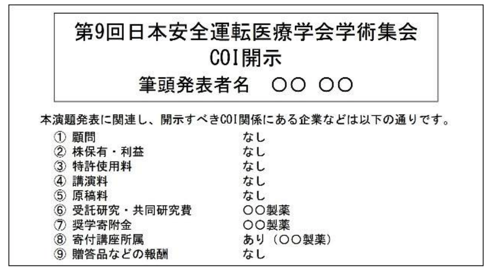・発表の際は、利益相反(COI)の情報開示をお願いいたします。利益相反の開示対象は筆頭演者のみとし、当該発表に関わる利益相反の有無を申告いただきます。筆頭演者は、利益相反の有り無しいずれにおいても、当日発表の際に下記(1)、(2)に従って開示をお願いいたします。口演発表の場合は最初のスライドの中で、ポスター発表の場合は冒頭あるいは末尾に、情報開示についてご記載ください。